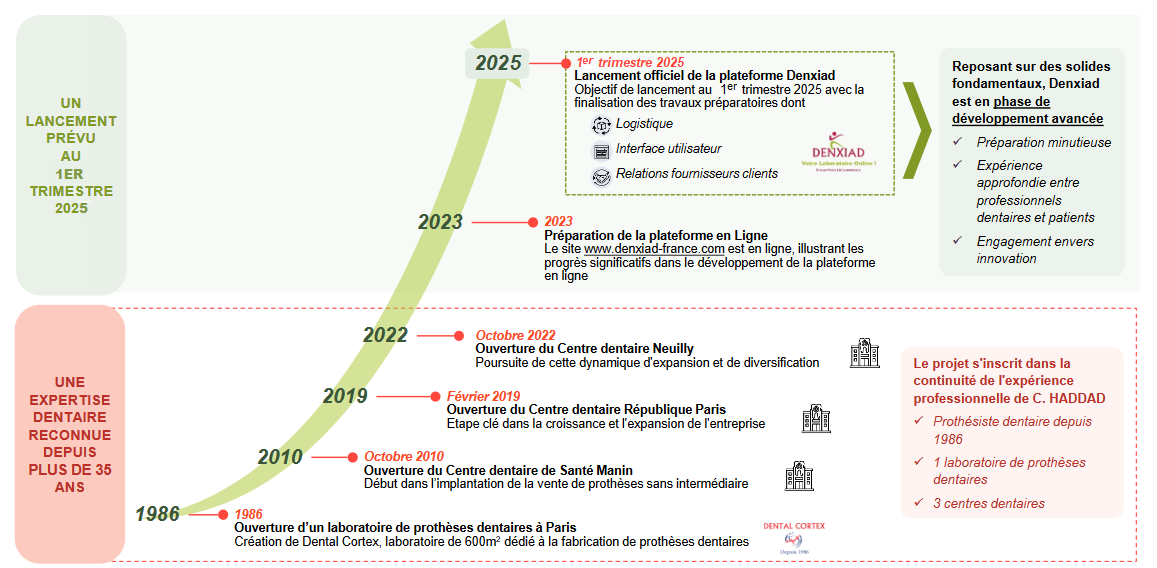 • Denxiad est une plateforme de vente en ligne de prothèses dentaires ayant pour Clients des chirurgiens-dentistes sous la forme de Cabinets Privés et de Centres Dentaires, avec une stratégie numérique et logistique similaire au modèle Amazon